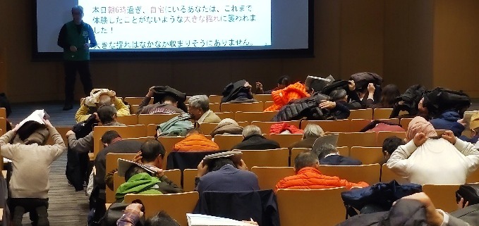 緊急地震速報が1回目に鳴った時には、身を守る行動を素早くされた方は少なかったのですが、「地震は、いつ起こるかわかりませんよ。その場で身を守る行動を素早く取りましょう。」と言ったのちに2回目を鳴らした時は、参加者全員が身を守る行動をされました。