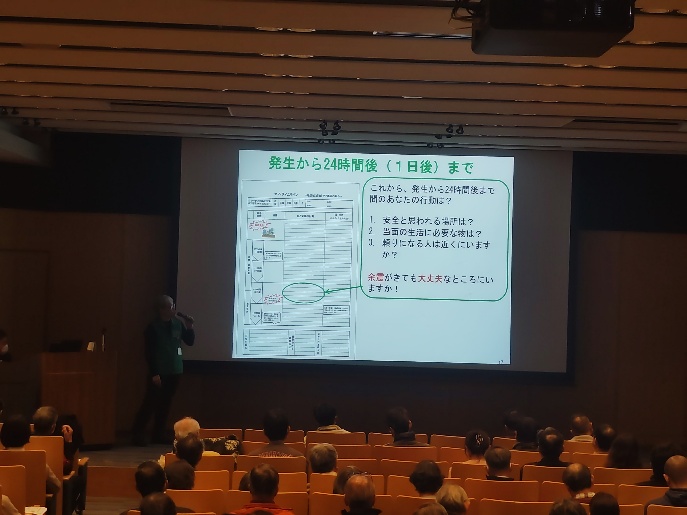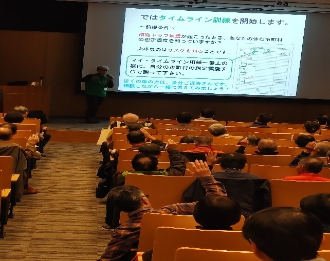 参加者は時間軸に沿って、自分がどう行動すればいいのか、どのような行動がとれるのかを考えながら、マイタイムラインを作成されていました。「死なない」「大けがをしない」ための日頃の備え、家族との安全確認方法、命の守り方などを熱心に聞いておられました。