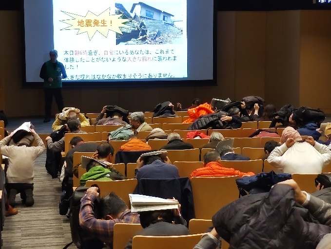 緊急地震速報が1回目に鳴った時には、身を守る行動を素早くされた方は少なかったのですが、「地震は、いつ起こるかわかりませんよ。その場で身を守る行動を素早く取りましょう。」と言ったのちに2回目を鳴らした時は、参加者全員が身を守る行動をされました。