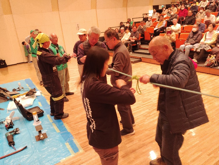 こういった講演の後、日本家屋の屋根瓦模型を使って、瓦屋根の構造やブルーシート展張方法、材料や道具、作業の危険性や安全な作業方法、アシスト瓦の作成方法、ブルーシートは屋根上以外でも雨漏り対策に活用できることを実技で学びました。
