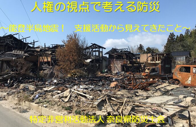 12月11日(木)、午後6時30分から桜井市役所大会議室において市の人権問題研修会の一環として「人権の視点で考える防災」と題して植村信吉防災士が講演を行いました。この講演は、奈良県防災士会が能登半島地震の支援活動に取り組んできた経験と体験に基づき、避難所での人権や自主避難している被災者への視点をもって防災を考えるとして開催されたものです。講演では、能登半島地震の際に支援に入った避難所(珠洲市正院小学校)の実態や課題に加えて、珠洲市や能登町における災害ボランティアア活動から感じた避難所生活での人権をどう守るのかについて問題提起がされ、なかでも、SNSでのニセ情報が如何に被災者を惑わせているかについて報告と注意点を訴えました。