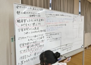 都祁中学校は市の指定避難所(二次避難所)になっていて、中学校が避難所になるときは大変な状況に陥っていることが予想されます。都祁では昼も夜も都祁にいる中学生を頼りにしていて、防災学習に力を入れています。生徒達も自分たちが役に立てることを実感してくれています。いつもながら新しい発見があり、都祁の安全のための有意義な一日となりました。