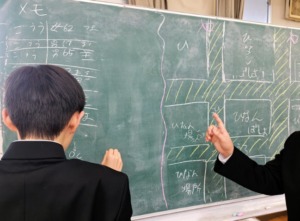 二年生は2回目なので、今回はイラスト入りの新地震バージョンを使用しました。このカードは通常のカードも改良されている上に、「コンマ5」のカードをところどころに挿入して使用出来るようになっていて、少し難しくなっています。昨年順調だった二年生もさすがに戸惑っていました。一年生は初めてのHUGなので通常のHUGカードを使用しました。